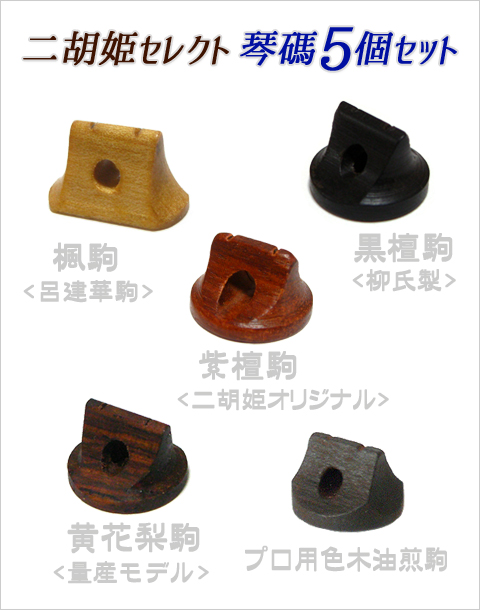 二胡の音を変えてみたい方へ、違う音が鳴る駒を5種セレクトの弾き比べセットです♪
