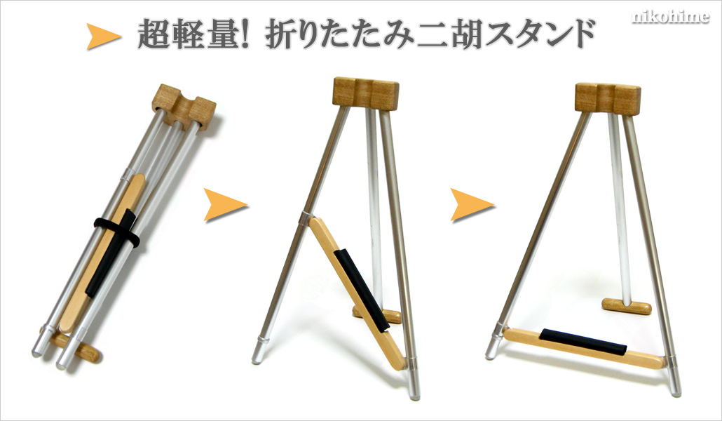 二胡弾きによる、二胡弾きのための“折りたたみができる二胡スタンド”!特徴はなんといっても、『 小さく 』て『 超軽量 』そして『 折りたためる 』!